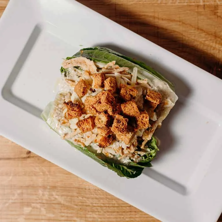 Featuring baby romaine hearts drizzled with our scratch-made Caesar dressing, topped with Beehive espresso lavender artisanal cheese, French fried onions, olive oil, a drizzle of hot honey, and house-made corn bread croutons.